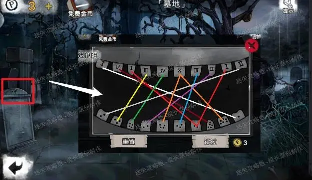 36、 墓地,红框处使用三个石块可以触动机关,升起棺材,打开棺材后左边的布下面一个娃娃头,进入小游戏:直接依照下图进行配对即可,变灰后就代表不会再弹出来,正确。小游戏上面罗马数字,下面点数,对应数字配对点击即可,完成后得到【螺丝刀】。