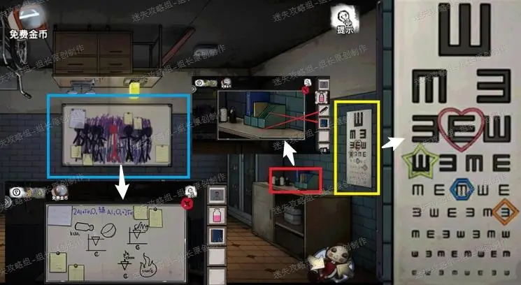 27、 药剂室,红框处首先可以得到【黑板擦】和【书】,黄框处可以得到密码提示,这个密码提示要使用到颠倒图书馆右侧的保险柜。蓝框点击放大后使用黑板擦,可以看到后面的铝热剂化学公式提示。
