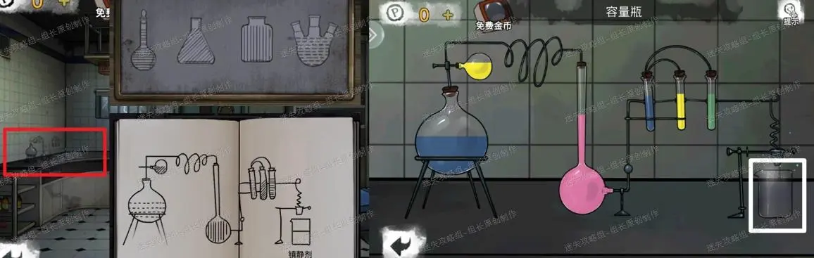 45、 前往正向实验室,开始制备镇静剂,提示分别来自图书馆窗前桌上,木屋里背后壁画。依照提示对应各个瓶子里的线条形状,然后参照笔记上线条形状对应的位置放入试剂,得到【装有镇静剂的量杯】。