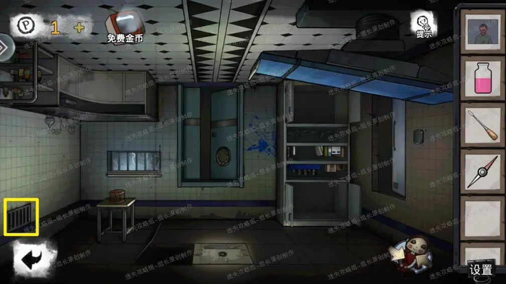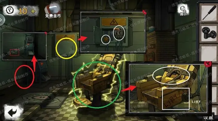 9、 治疗室这里先点击红圈放大后得到地上的【扳手】。用扳手打开边上黄圈的电箱,得到里面的【木块】同时把边上的电闸关掉(边上的电椅就没电了)。点击中间的绿圈放大后(有电的话先去前面步骤断电),拿到电椅上面的水龙头,同时边上的四个字母是病房床头柜的密码,先记住。当前其它内容暂时不能进行互动。