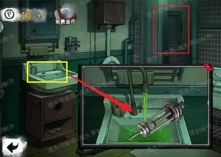 12、 前往卫生间,红框处拉开浴帘后上面的铁板使用扳手,打开后进入小游戏(游戏完成后跳跃过快暂时无法提供完成版截图,注意各个水管相连即可)完成后就能有水到洗漱池。黄框处点击放大后装上水龙头,之后拧开水龙头开关,对放出来的液体使用巨型针头得到【装满水的针筒】。