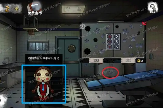 7、 到达病房。红框处点击放大后左上角的凹槽放入铜制面具,打开抽屉得到【蓝色指针】。前往走廊。