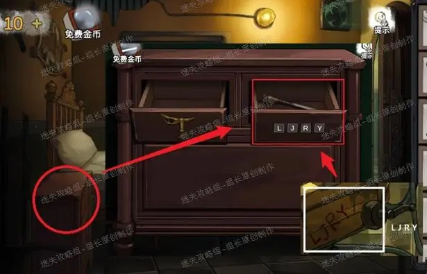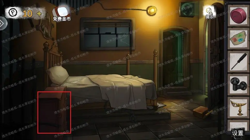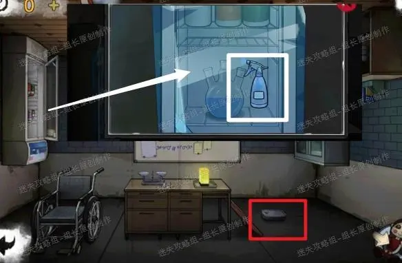 11、 前往病房,红圈处床头柜使用实验室电椅上的LJRY,打开后得到【凿子】。