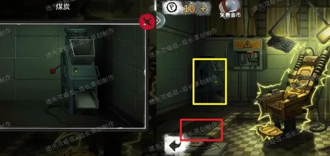 16、 前往治疗室,先点击电箱打开电源,然后点击左侧的碾碎机,装上拉杆,并放入煤炭可以得到【煤灰】,红框处点击放大后对里面的盒子使用金属装置,得到【羊头装置】,之后去卫生间。