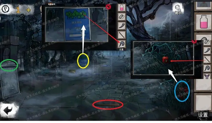 34、 墓地,红圈先拿上【木棒】,黄圈拿上【石块】-2,绿圈拿上【面具】,篮圈使用木棍拨开荆棘后得到【汽油桶】,得到汽油桶后,将汽油桶、木棍、纱布组合成为【火把】(未点燃)。