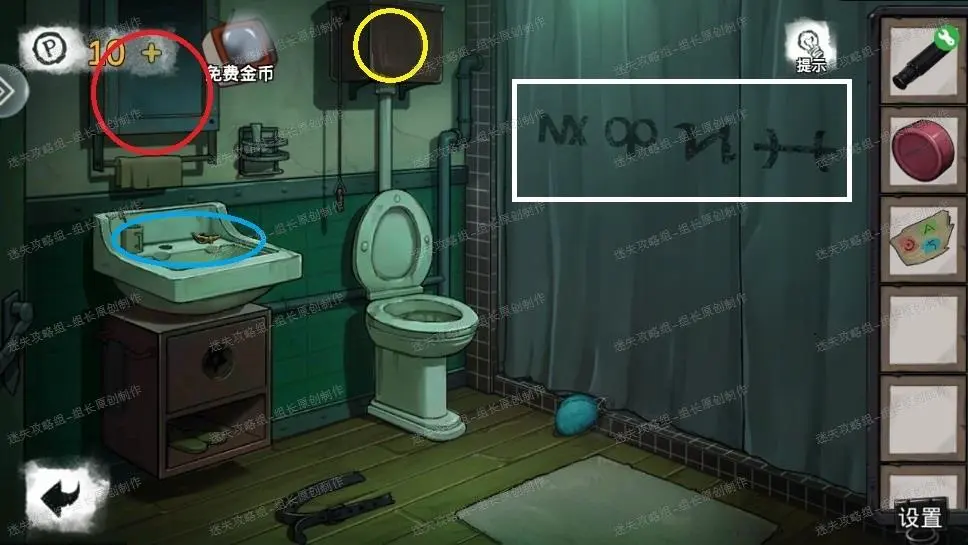 5、 卫生间里,白框首先记住,这是后面需要的密码(走廊密码门)。红圈处点击放大后多次点击可以得到【玻璃碎片】。黄圈处点击打开后得到里面的【螺丝刀头】,直接螺丝刀头和之前的螺丝刀柄组合得到【十字螺丝刀】。蓝圈处放大后得到【铜制碎块】-1拉开白框的帘子以后可以看到浴缸,当前暂时不能做什么。