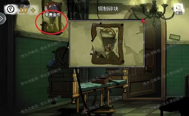6、 走廊左侧红圈处点击放大后使用玻璃碎片划开可以得到【铜制碎块】-2,这个铜制碎块与攻略步骤5得到的铜制碎块组合得到【铜制面具】。