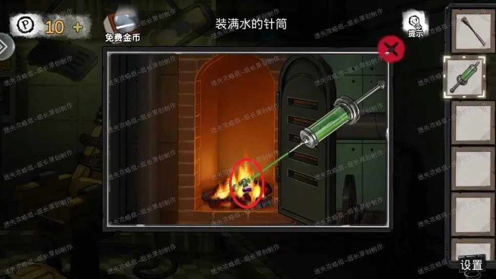 13、 前往治疗室,对边上火炉点击放大后打开门,使用装满水的针筒,灭掉火之后得到【紫红色液体】和【煤炭】。