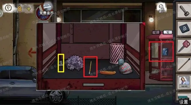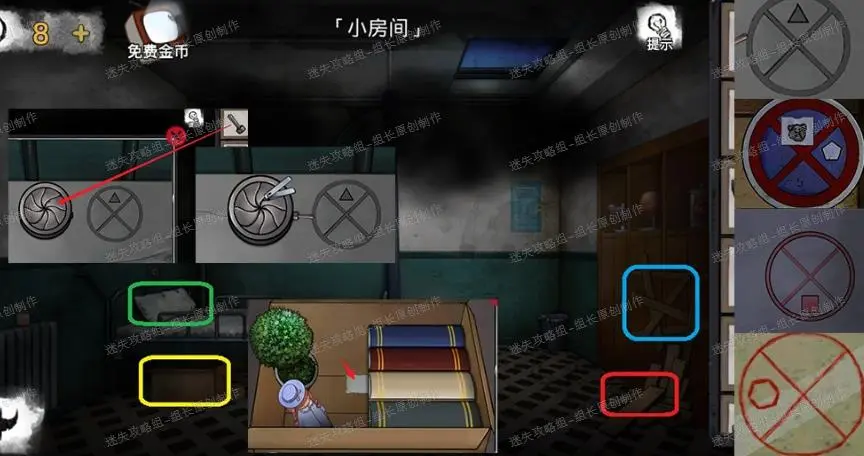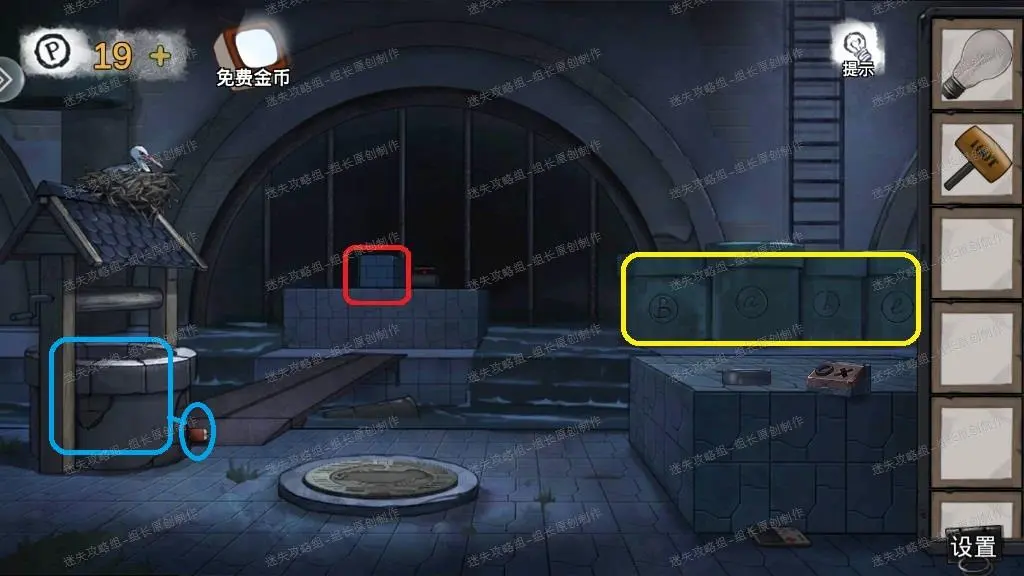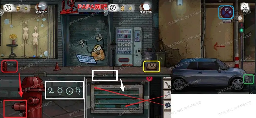7、 下水道,红框处点击放大后先拿上【阀门】,之后对方块使用锤子可以得到【金币】,黄框小游戏暂时不可用,左边蓝框点击放大后得到蓝圈的【缺少枪头的燃烧瓶】。