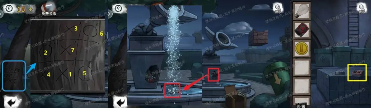 8、 花园,喷泉红框这里放大后装上阀门,点击阀门送水后得到喷出来的【叉】按钮。之后去下水道,对黄框使用叉按钮后可以点击圈叉了,点击顺序的提示来自于花园左侧的树(下图蓝框处点击放大就可以看到),最后答案这里给出:叉圈叉叉圈圈叉,完成后得到里面的【五角星】。