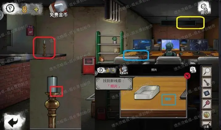24、 网吧,点击王明哲得到剧情买水。红框处放大后得到烛台上的【钥匙】。黄框处点击放大后得到【硬币】。蓝框处放大后得到【火柴】、【【照片】】-线索。