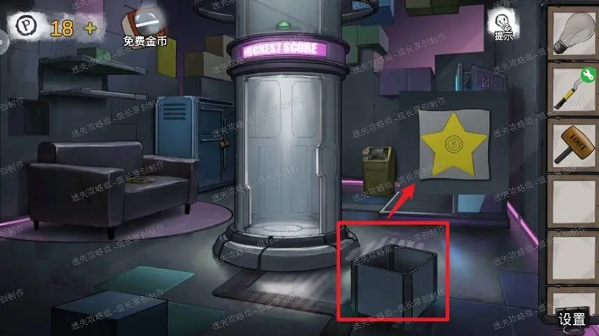 5、 方块屋,红框处箱子放入蘑菇头就能打开,得到里面的100T【锤子】,同时看到箱子底部的五角星图案,后续要用的提示。