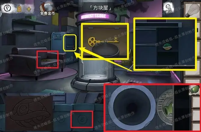 11、 方块屋,红框处对钥匙形状模具使用液态黄金,得到【金钥匙】。之后用金钥匙打开黄框处的柜子,得到乌龟壳。乌龟壳去下水道的一堆管道这里对E标记管道使用(提示在花园的骷髅箱子拿完以后露出的图案上),得到【绿色浮雕】,绿色浮雕直接放到下水道地下的窨井盖上就能进入客厅。