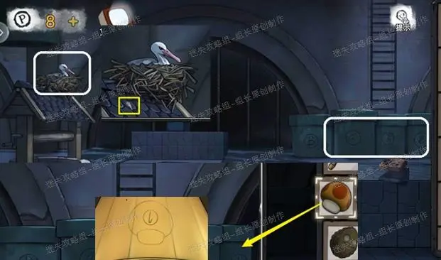 13、 花园,红框处问号箱子点击放大后放入问号,得到【蘑菇】,同时黄框处的树上使用晾衣杆得到【坚果壳】。