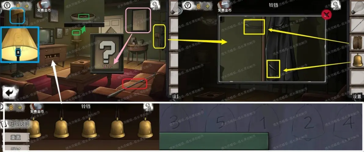 12、 客厅,红框得到【晾衣杆】,黄框处得到【绳子】、【晾衣杆】,绿框得到【虫子】。之后蓝框处点击放大后放入灯泡。打开开关亮起来就能看到提示,先记住,后面会用。白框处点击放大后放入铃铛,进入小游戏,小游戏的提示在方块屋的隔板上方墙上有,下图直接给出,依照顺序点击铃铛后打开抽屉,得到【红色马克笔】,边上的盒子暂时打不开,继续客厅界面粉框处点击放大后使用红色马克笔涂写,涂满后(包括下面的点)就能得到白色问号,同时下面的数字是后续线索,记一下。