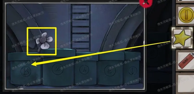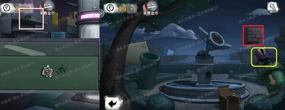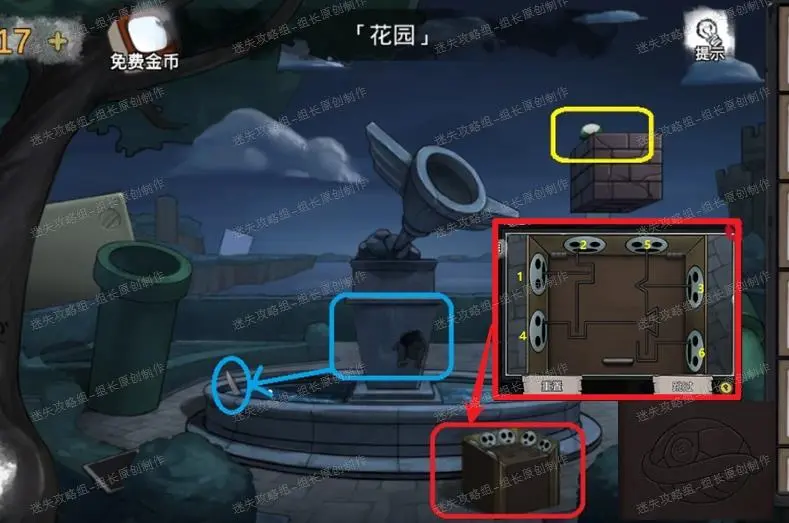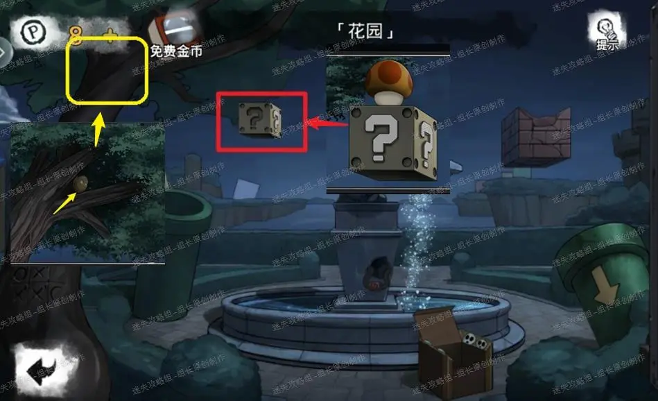 4、 花园,首先点击红框处的箱子点击放大后完成小游戏,解法如图,完成后就可以得到【灯泡】、【蘑菇柄】,同时拿完东西后下面有一个乌龟图形是后续的提示,记住。黄框处点击放大后可以拿到【蘑菇头】,将蘑菇两个部件组合到一起就能得到【绿蘑菇】。之后点击蓝色框,放大喷泉部分查看。喷泉部分蓝圈处得到【半把园艺剪刀】。