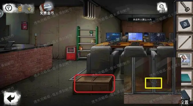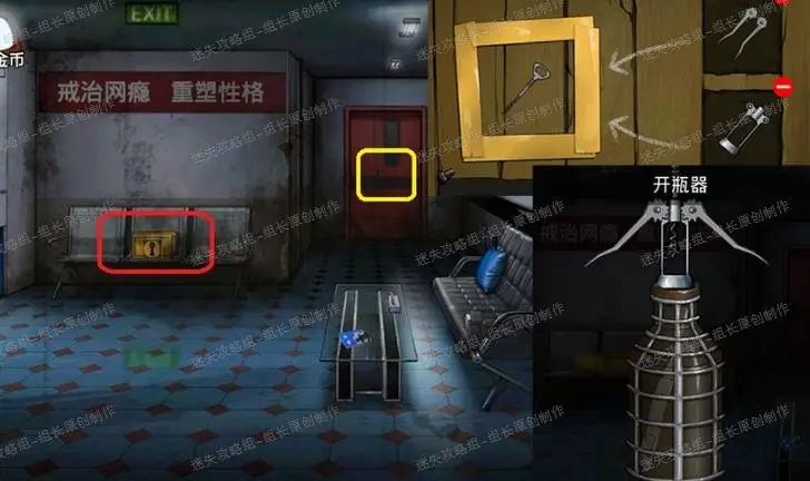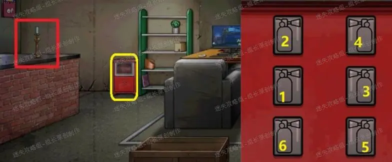 35、 网吧,红框处使用点燃的火柴点火,之后把被蜡封住的浮雕放上去烤化得到【浮雕】。黄框处放入灭火器按钮进入小游戏,完成后得到【缺少喷粉管的灭火器】,与喷粉管组装得到【灭火器】。35