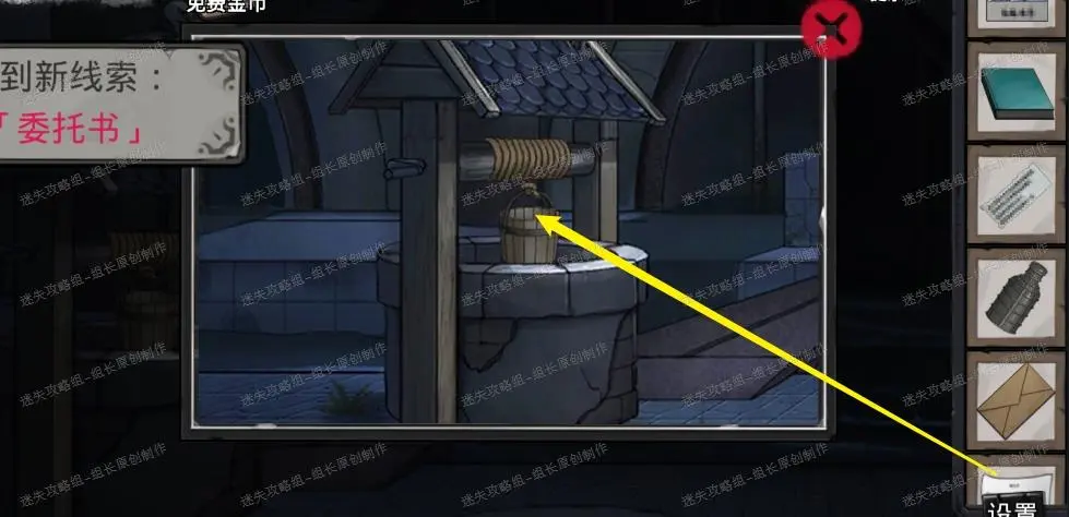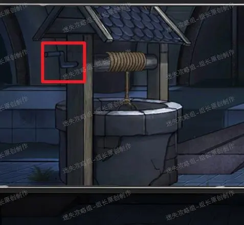 下水道,水井点击放大后使用绳子和空木桶,然后点击红框处就能得到【盒子】,拿到盒子之后重新使用红框摇杆,再舀一次就能得到【【委托书】】-线索。