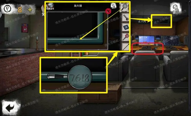26、 网吧,王明哲走开后点击红框,得到【日记本】、【小圆灯】。黄框放大后使用放大镜对箭头处使用,看到密码提示(用在街道最右侧箱子上):7618。