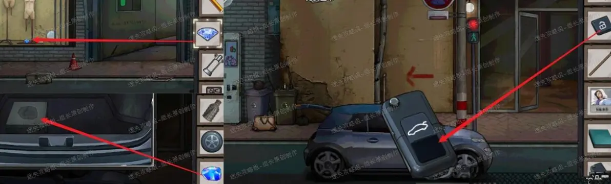 33、 街道,前往橱窗,使用钻石划开玻璃后得到【宝石】,之后前往汽车后备箱,对后备箱里的盒子使用宝石,得到【被蜡包裹的浮雕】。之后对汽车使用车钥匙,就能看到车钥匙在画面上,把解锁按钮装上车钥匙后按下解锁键打开车锁,车门打开后进入车厢。