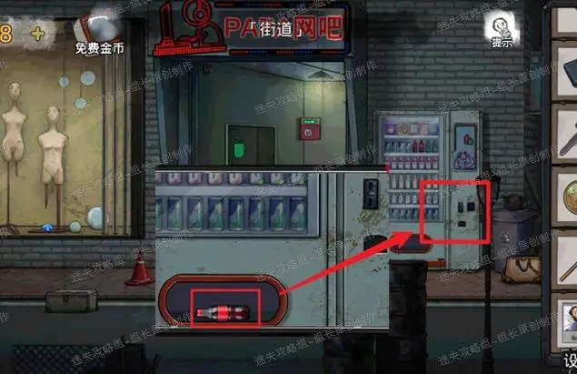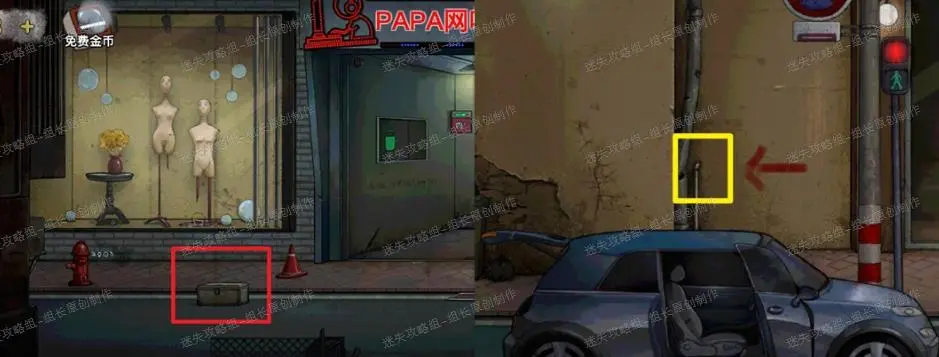 23、 街道,红框处首先拿到【铁链】,同时看到线索。黄框处拿到【放大镜】。绿框处点击放大后得到【小钩子】。组装链条和小钩子得到【链钩】。去到灰框处排水沟使用链钩得到【钥匙】顺便拿上【按钮】,蓝框处得到【开关】。街道暂时搜刮完毕,前往PAPA网吧,点击网吧卷帘门,插入钥匙进入。
