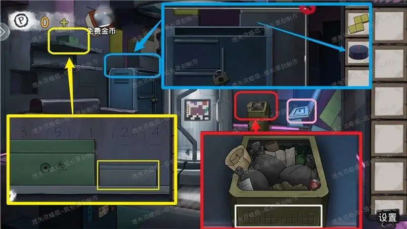 1、 方块屋,红框处垃圾桶首先放大后的得到里面的【方块】-1,同时下面白框处是后续要用的提示,这个提示直接到黄框处点击放大后输入到右边的灰色盒子上,得到【方块】-2。蓝框处放大后右上角位置可以得到旋钮,旋钮直接放到粉框的游戏机上点击旋转,进入小游戏。