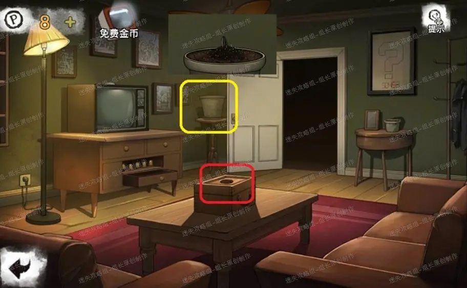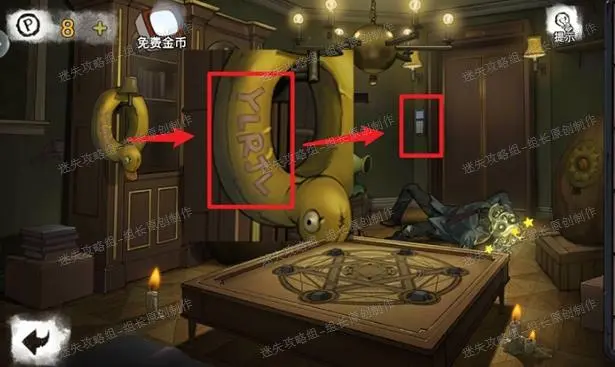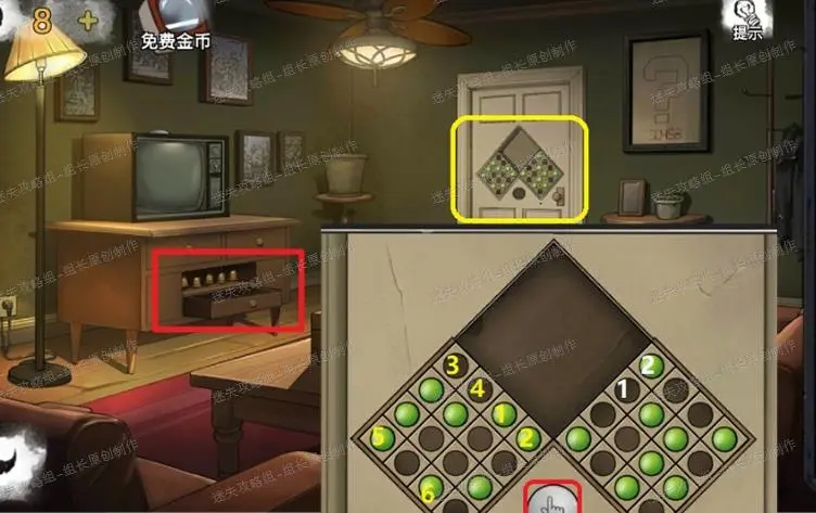 15、 客厅,红框处对抽屉里的盒子使用钥匙,打开后得到【按钮】,之后前往黄框处,放入按钮后进入小游戏,小游戏依照下图解法直接依照序数点击对应位置,左右分别点击,完成后红框点击即可完成小游戏,可以进入书房。