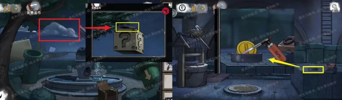 10、 花园,风扇去红框处使用后吹开云雾,得到【喷火枪头】,枪头与燃烧瓶组合成为【喷火枪】入手,前往下水道,黄框点击放大后对容器使用金币和喷火枪得到【液态黄金】。