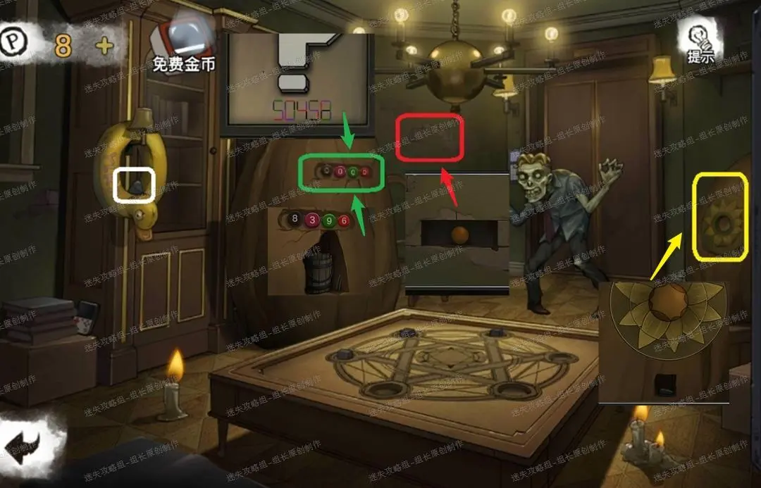 16、书房,白框处点击后得到【石块】-1,红框处放大后点击砖块拿开,得到里面的【圆块】,去黄框处放入圆块,进入小游戏,这里注意,小游戏总共内中外三层,这里建议先用外圈找到外中两层的正确位置(看花瓣中间的纹路对齐),之后慢慢移动内圈(移动一点内圈,外圈就跟进到外中对应,再移动一点内圈,重复直到完全对齐)小游戏完成后得到【种子】。绿框处点击放大后输入密码,密码为8396,提示来自于客厅的问号画框下面的数字,画框下数字中对应颜色的线段数量才是密码数字:黑色8个,紫红3个,绿色9个,红色6个(原攻略错误,实际为每个同颜色杠杠平移到一起组合成为单一颜色数字),打开后得到【空木桶】、【天线】。