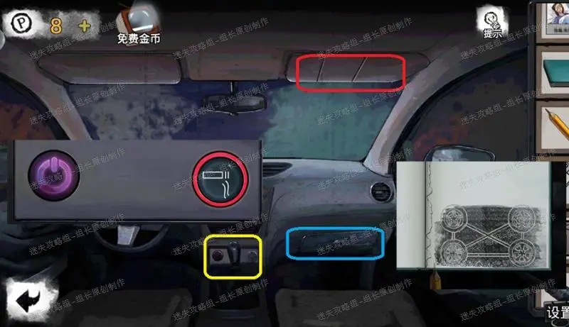 34、 车厢内,红框处得到【开瓶器部件】,将点烟器装入黄框处,先按下左边的按钮启动车子,之后按下点烟器就能得到【烧红的点烟器】,将烧红的点烟器与火柴组合得到【点燃的火柴】。蓝框处装入轮胎滑块,之后打开道具栏里的笔记本翻到第二页,使用铅笔后得到提示,依照提示完成组合(技巧:先完成上面两个,下面就简单了),完成后打开得到【喷粉管】。车厢内内容全部结束。