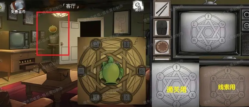客厅,电视机点击放大后装上天线,之后旋转电视上的旋钮得到提示,这个提示的背景是白色的,后面设置完魔法阵拿到豌豆射手之后,回到电视机可以看到画面变成棕色,图形提示变成另一个提示,将这个提示输入到魔法阵里可以得到一个信封,打开后得到【【信】】-线索)。