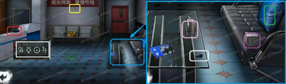 31、 网戒中心,红框处拿到【铅笔】,同时边上的盒子输入街道消防栓边上的白色符号顺序打开得到【钻石】。黄框处得到【开瓶器部件】。蓝框放大后,绿框点击移动开后得到【灭火器按钮】,白框【点烟器】,粉框【瓶子】,紫框点击放大后使用数字灯进入小游戏。