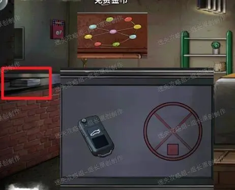 28、 网吧,红框处使用两个小圆灯之后进入解谜,将颜色通过点击设置成街道箱子上方的提示颜色(注意,中间的X形状有不同,是90度旋转的),打开后得到【车钥匙】同时看到提示。