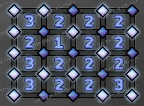 32、 数字灯小游戏类似扫雷,每个数字代表了自己身边的四个菱形灯有几个是点亮的,依照下图完成即可,完成后得到【轮胎滑块】。