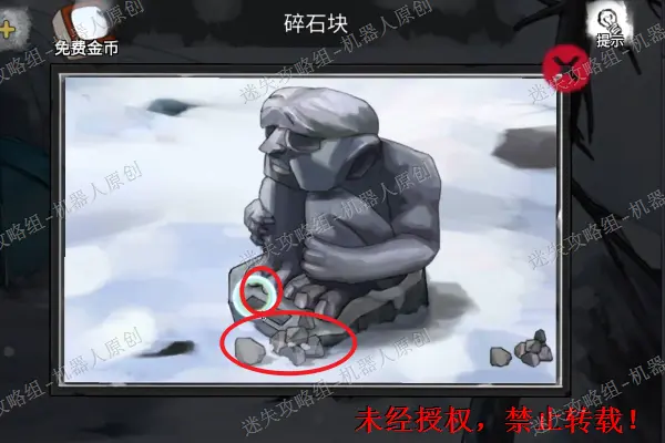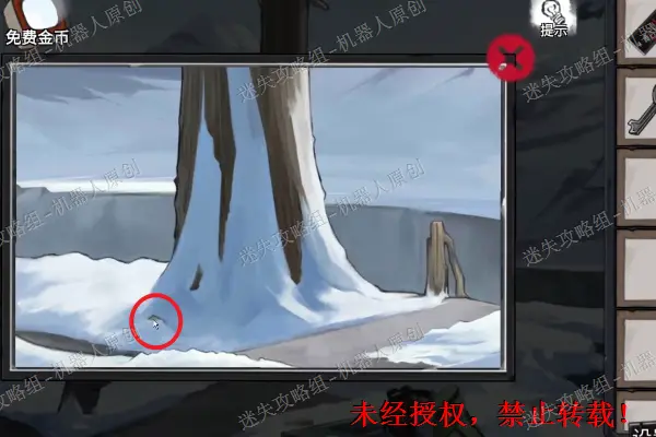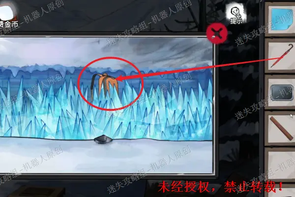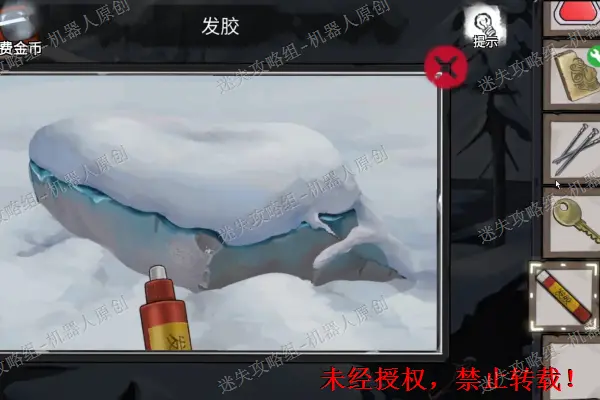 13、 再次回到树屋前面的雪地,查看被冻住的石头。使用发胶以及有油的打火机。之后将“石块”拾取。13.1
