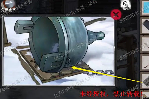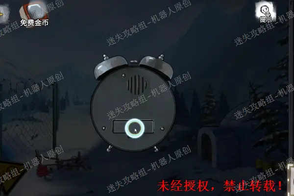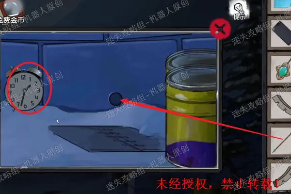 38、 再次回到湖畔,之后将雪屋旁边的油桶进行拖动。之后将它移开拿走“闹钟”。然后对墙壁上面的孔使用“箭”之后得到“钥匙”。38.1