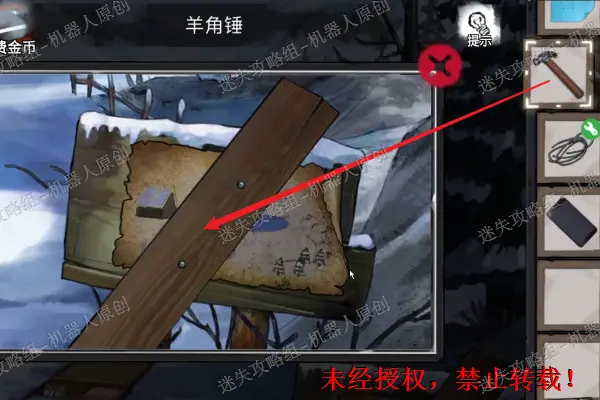 33、 之后查看右下角的指示牌,使用“羊角锤”将木板上面的钉子给移除,之后得到物件“窄木板”之后查看左边的棚子,使用“羊角锤”将“窄木板”给取下来。33.1
