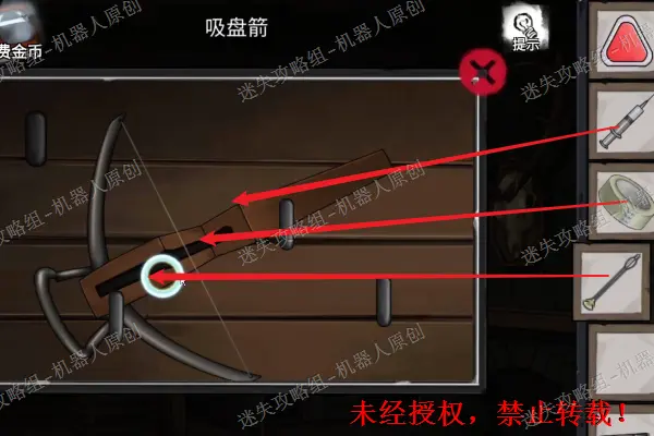 21、 回到木屋里,查看墙壁上面的弩箭,将“吸盘箭”以及“麻绳”放置上去。之后使用刚才得到的新的针筒。再使用胶带进行固定。之后得到“装有麻醉针的弩”。21.1