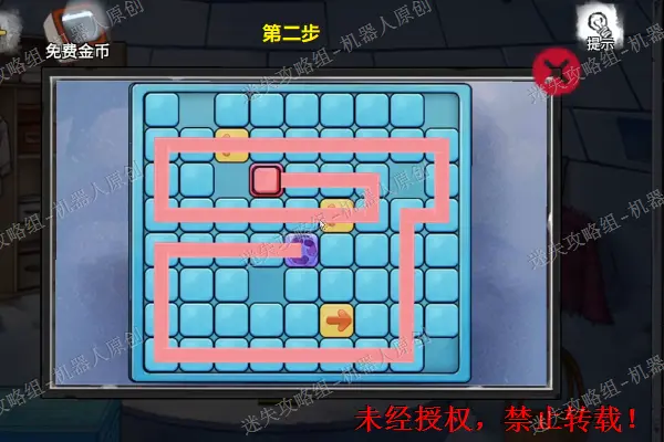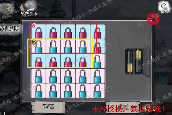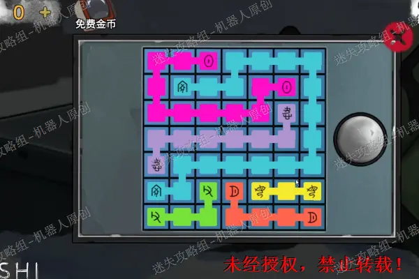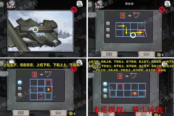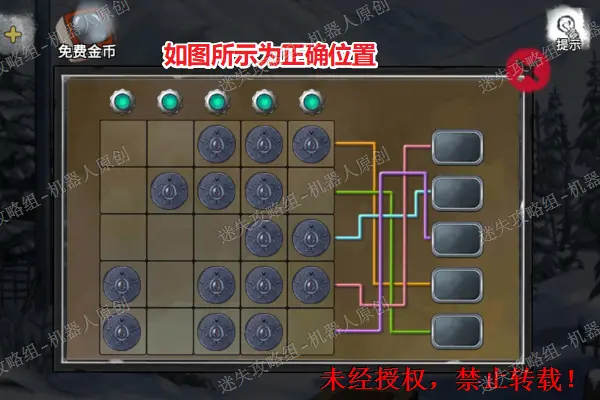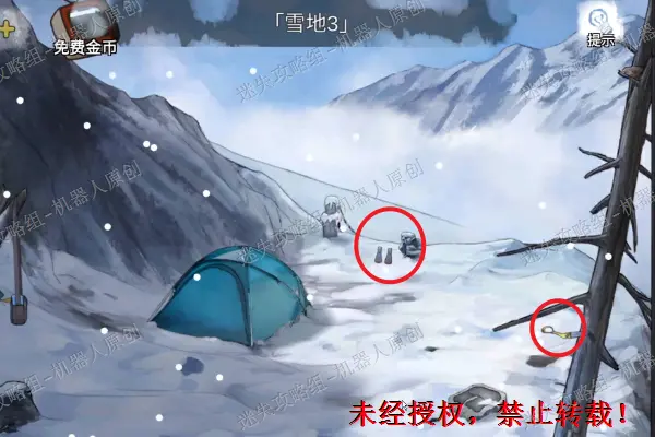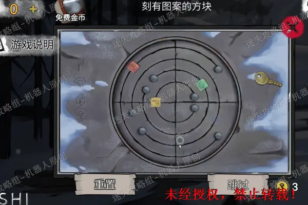 12、 回到木屋前面的雪地,查看背包旁边的盒子,将“圆形按钮”放进去并且按下去。之后完成谜题(相同颜色连线),成功之后得到“发胶”。12.1