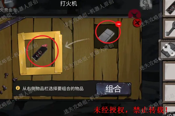 3、 将之前得到的煤油以及打火机进行结合,变成全新的物品“有油的打火机”。3.1