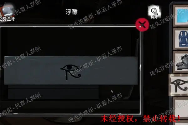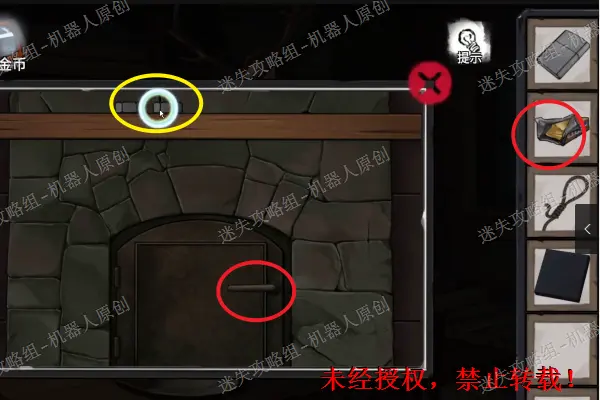 41、 回到围墙外面之后,查看最左边的刻上有浮雕图案的石头,将三个“浮雕碎片”放进去。打开石洞之后,拿走“狗尾巴草”以及“门把手”。41.1