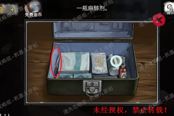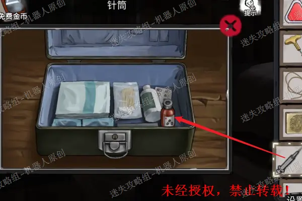 20、 回到树屋里面,查看桌子上面的急救箱,对麻醉剂使用针筒,之后得到新的道具“装有麻醉剂的针筒”。20.1
