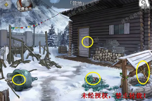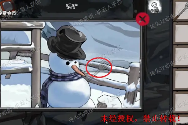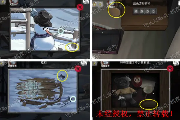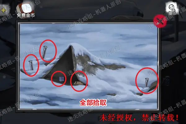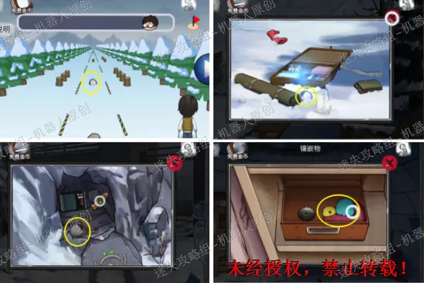 首先查看雪人,取走上面的铲子。之后使用铲子将右边的堆积的雪全部清除掉。取走上面的碎片,之后打开右边的绿色书包,取走煤油。1.11.2