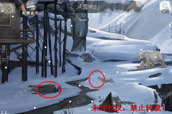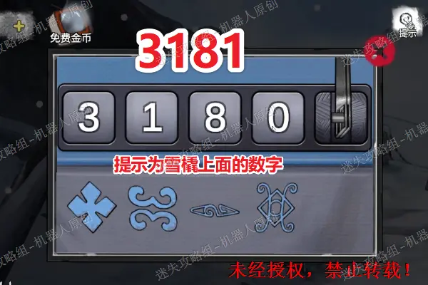 22、 来到树屋前面的雪地上,对白熊使用刚才的弩箭,将它击倒之后进入有帐篷的雪地里面。之后查看树干上面的包,之后根据雪橇上面的提示。(需要注意的是提示是从里面的四列数字里面将规律找到)输入密码3181之后将背包打开,将线卷以及针获取。22.1