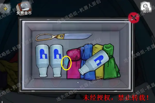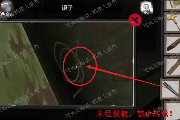 18、 使用钥匙将急救箱打开,将镊子拾取。之后用方形嵌体将梳妆台上的抽屉打开。将透明胶带收集起来,之后使用镊子将梳妆台后面夹层里的麻绳收集起来。18.118.2