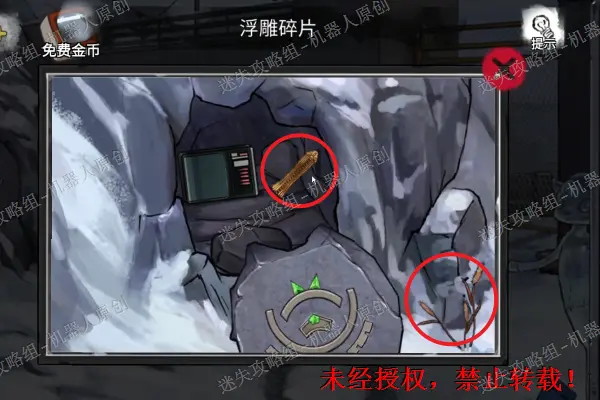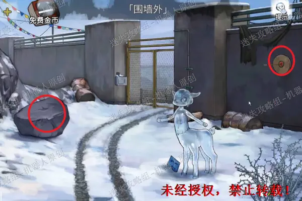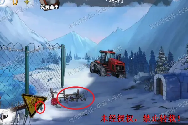 36、 告示牌上获取“吊坠”,垃圾堆里面拿走“浮雕碎片”。之后点击查看远处的雪地,进入到围墙的外面。36.1