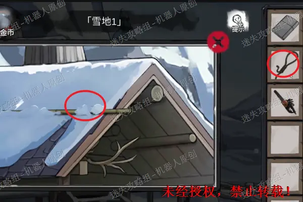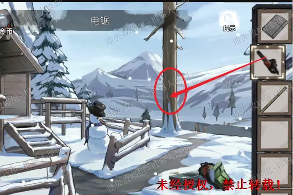 8、 查看地面上的电锯,之后使用之前得到的链条,螺母,导板。再次点击将它收集起来。回到木屋外面的雪地上,使用之前得到的套索将屋顶上面的竹竿得到。8.18.2