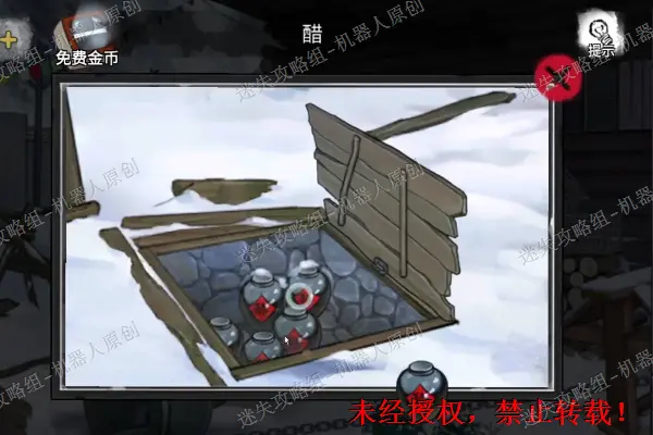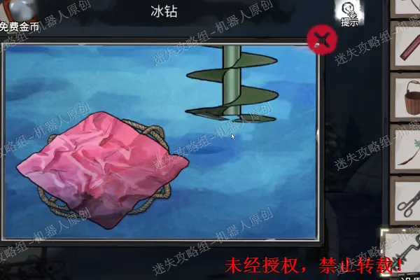 59、 将之前被压住的地窖门打开,将“醋”取走。再次回到湖畔。点击查看雪屋旁边的油桶,点击查看地面上的门。使用“钢丝刷”以及“醋”将锈迹进行去除,开始进行小游戏,挖成之后得到物品“发簪”。59.159.2