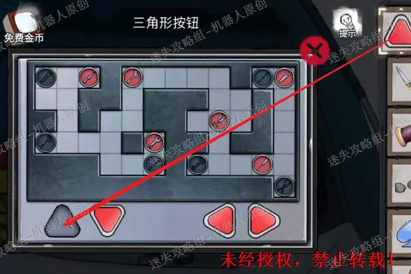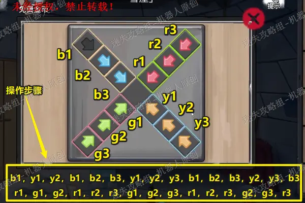 26、 点击查看帐篷里面的衣服堆,找到盒子之后将“三角形按钮”放进盒子里面,开始进行盒子上面的谜题(步骤为:↓←↓←,→↑←↑,→↓←↑,→↑→↓,←↑←↓,→↓→↓,←↓→←,↑←)成功之后得到第二把“半把剪刀”以及线索“便签”26.1
