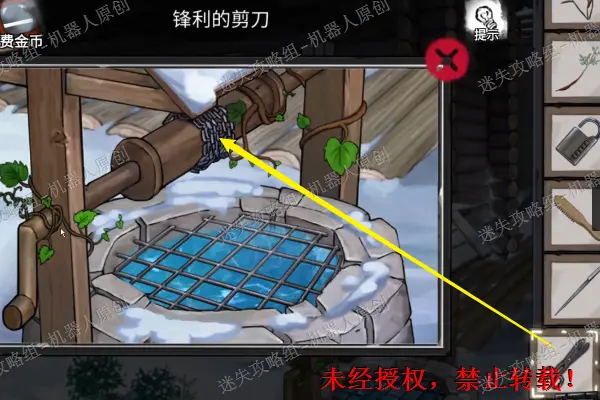 57、 将“钝剪刀”“磨刀石”进行结合之后得到新的物品”锋利的剪刀”使用它将水井的木藤剪断,之后将“链条”拉出来。57.1